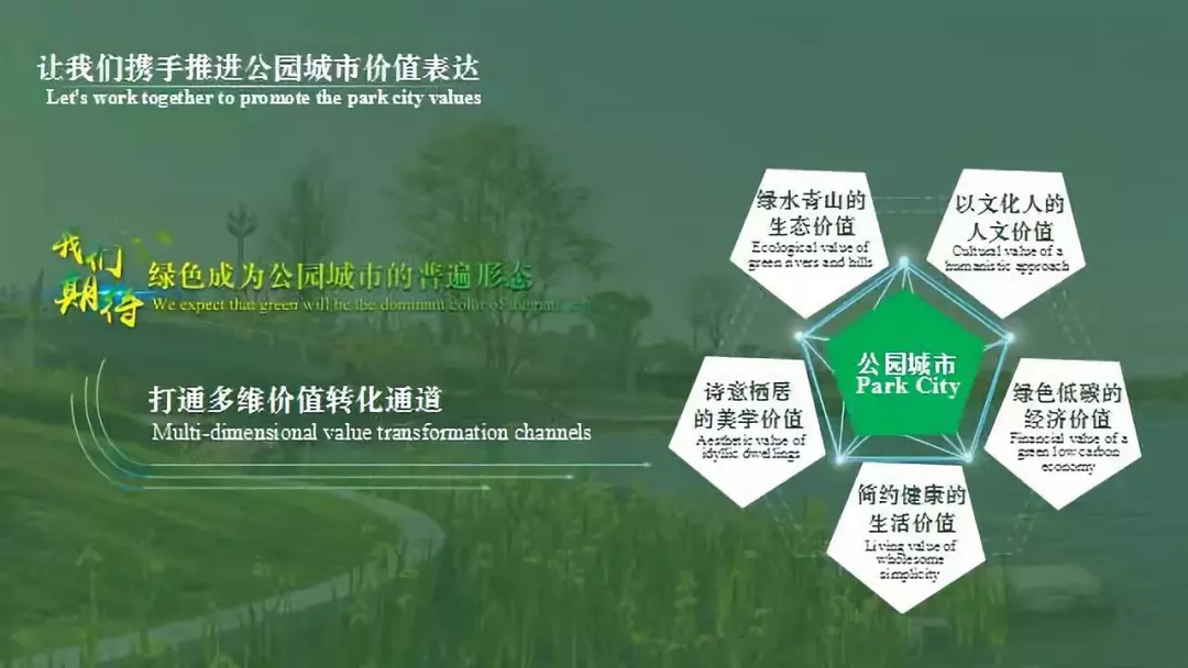 我們應積極彰顯公園城市綠水青山的生態價值、詩意棲居的美學價值、以文化人的人文價值、綠色低碳的經濟價值、簡約健康的生活價值和美好生活的社會價值,引領城 市價值新方向,塑造城市競爭新優勢。 |