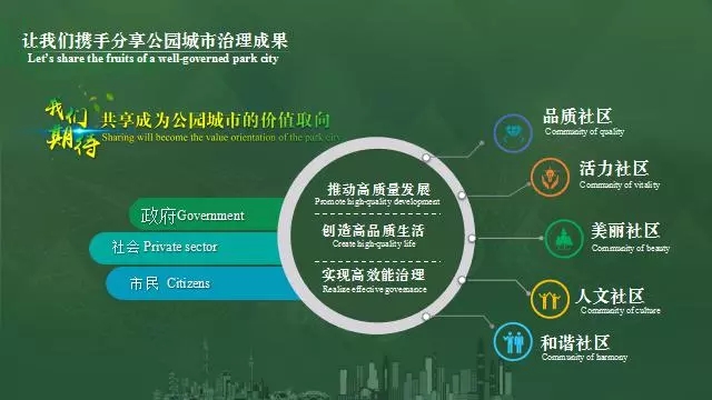 公園城市引領社會治理方式變革,統籌政府、社會、市民三大主體,以黨建引領城鄉社區發展治理,充分發揮基層黨組織核心作用,搭建法治、友善、公益的合作共治 平臺,推動城市發展、社區治理、民主參與,形成共建共享新型社區發展共同體,實現超大城市治理體系和治理能力現代化。