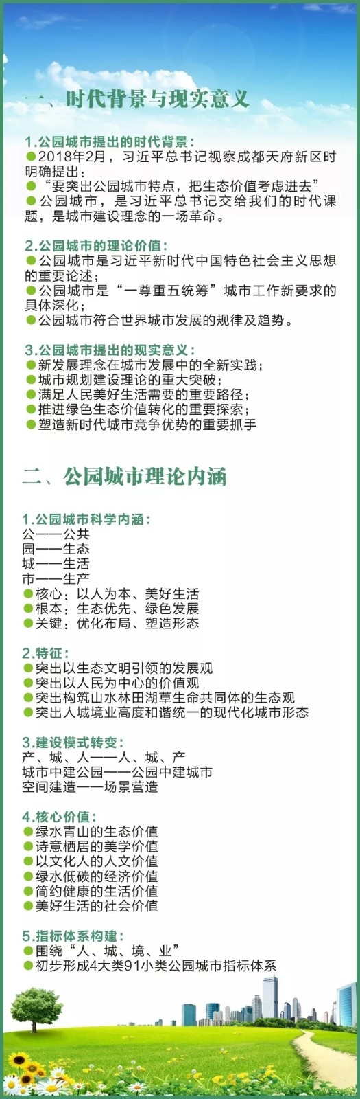 公園城市理念蘊含大歷史觀、體現哲學辯證思維、充滿為民情懷,是新時代城市發展的高級形態,是新發展理念的城市表達,是城市文明的繼承創新,是人民美好生活的價值歸 依,是人城境業高度和諧統一的現代化城市,具有極其豐富的時代內涵。