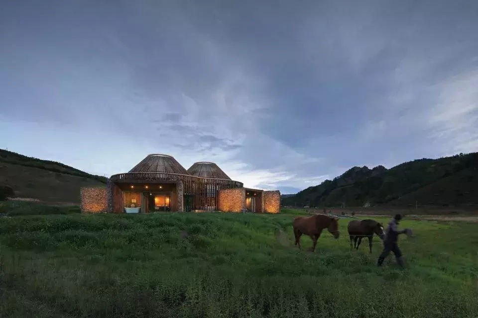 自古以來的建筑形象功能就與符號學緊密的聯系在一起。本案建造場所是一片大草原,如何的建筑才能不違和的融入場所呢?設計師試圖從蒙古包中尋求靈感,其作為一種獨特的建筑形式卻是草原的圖騰。