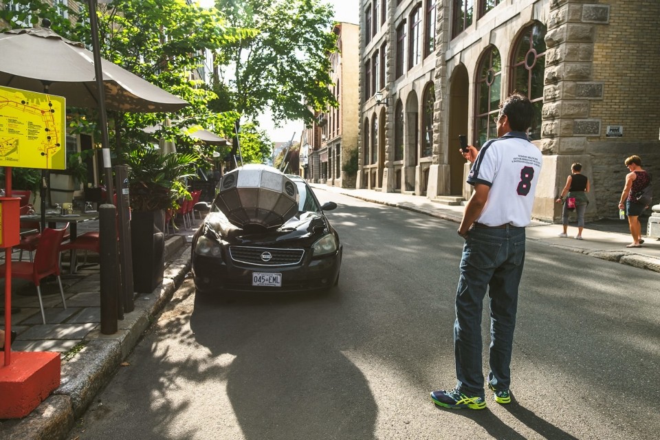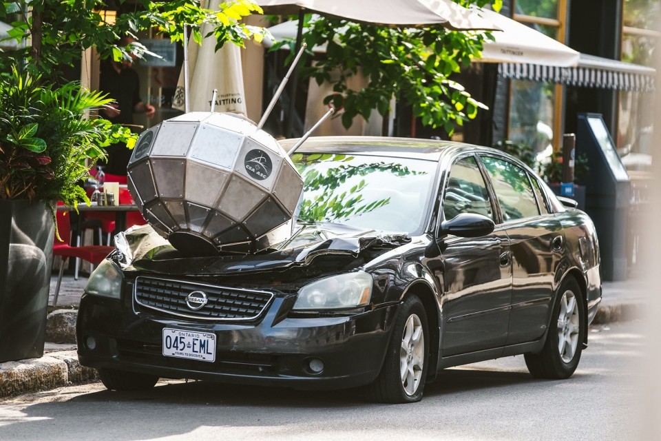 Alouette consists of a replica of the 1962 Canadian satellite Alouette-1, installed as if it has crash landed into a parked sedan. The Alouette project is a metaphor for the unfulfilled promise of a future of scientific advancement once heralded by modernism. The sleek futuristic design of the crashed satellite, resting lifelessly on the crushed car, evokes a modern-day Icarus whose blind faith in technology led to his swift demise, sending him falling back to earth.