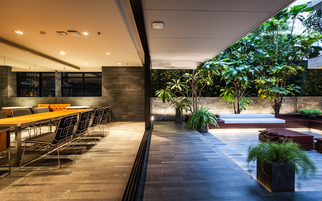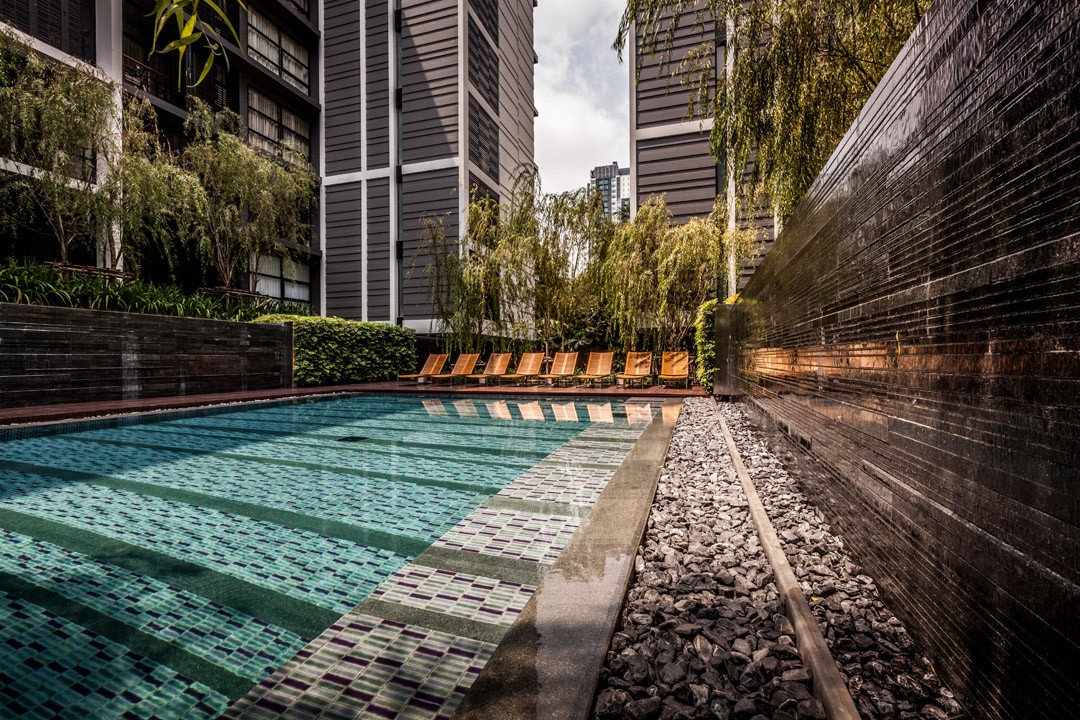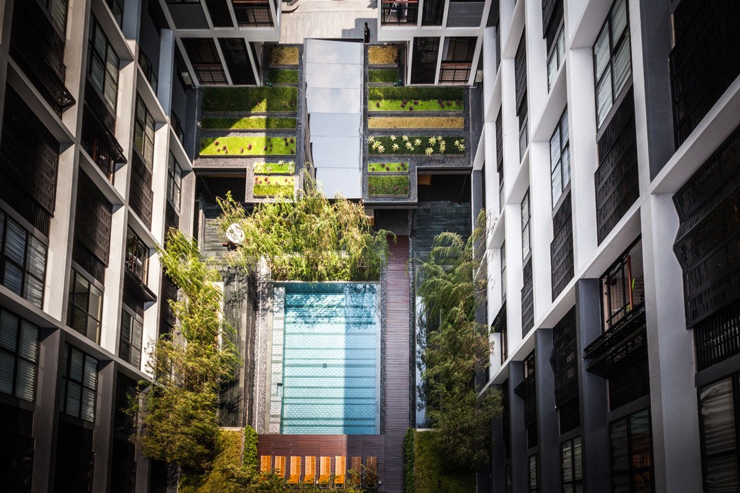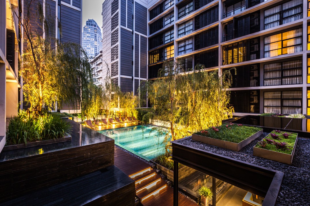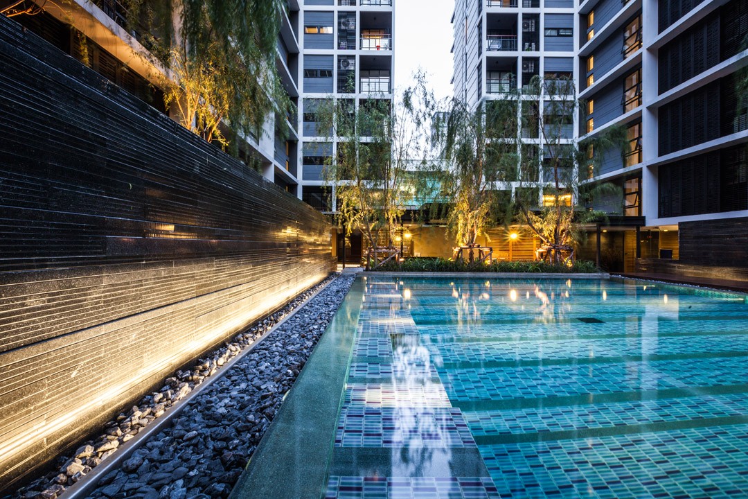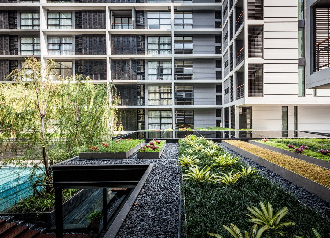 泰國城市中一個安靜的公寓公共花園,這個花園只依附一獨棟公寓存在,面積有限卻層次豐富,空間多重?;▓@能夠支持多種活動且保證彼此不被打擾,同時滿足了樓上的用戶朝下俯瞰時的美觀。不同高度水面與跌水還有那地面和墻面以及屋頂都存在的綠化,這里宛然一個水與綠的三維劇場。輕垂的柳枝成為天然的屏障,保護泳池隱私。天然石材和天然木材是硬質景觀的主材,它們被精心運用而具有豐富的細節,為用戶提供了一個質樸同時品質的戶外空間。