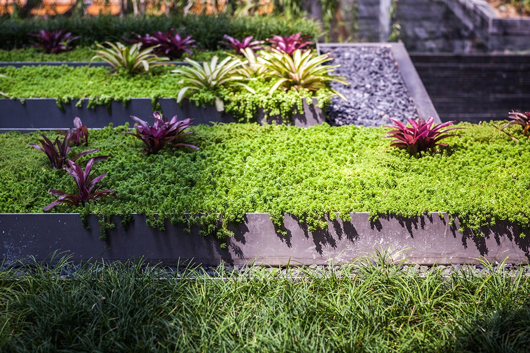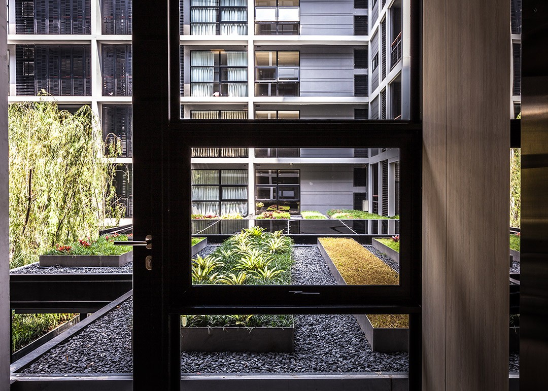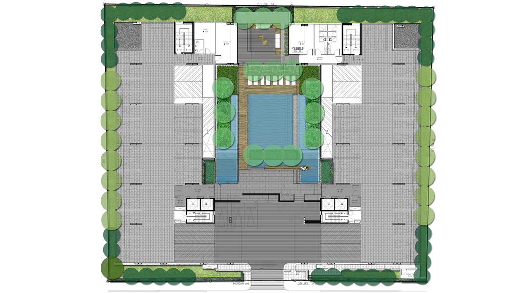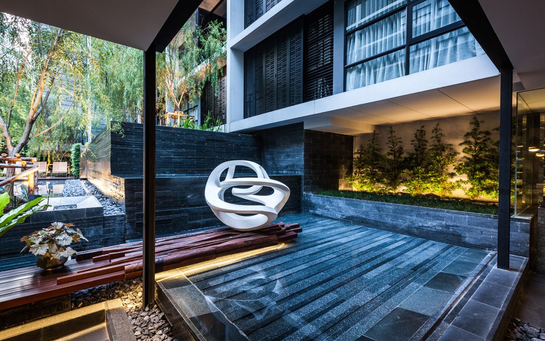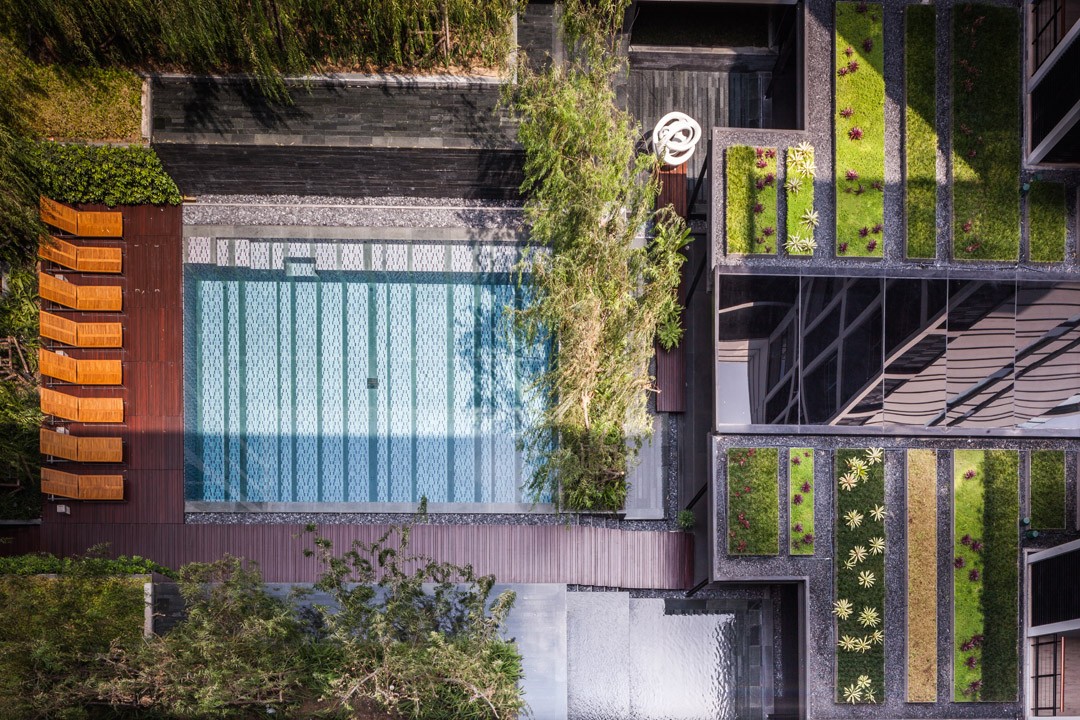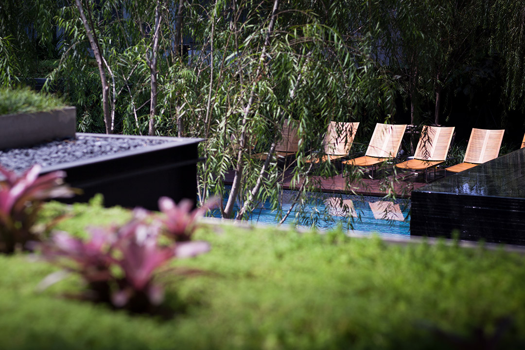 In response to dense urban surroundings of Bangkok, the main landscape area is conceived as an internal courtyard to create an inverted tranquility. The landscape space is split in multi-level to achieve privacy for each activity within limited space and also to create a dynamic view from the balcony looking down. This is resulted in 3 dimensional plays of water and greenery; from reflective pond to water wall, from green roof to green wall. Willow tree is selected as a feature for its feather light leaf draping down forming a natural blind for the privacy of the room and swimming pool. Surfaces are finished in a well-defined natural stone and enriched with intricate detailing of wood work for outdoor lounges to bring about an urban and yet rustic outdoor dwelling.