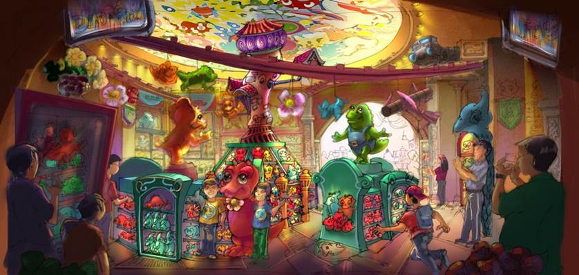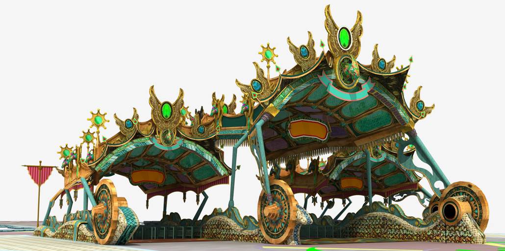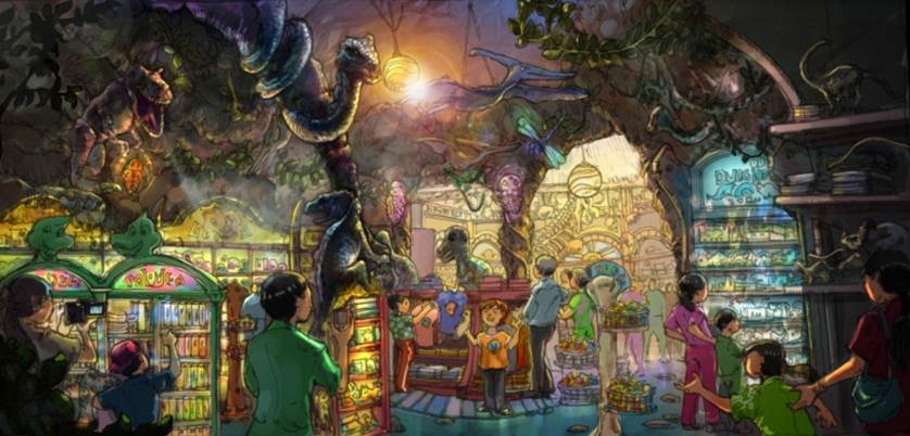 我們突破了一般主題公園大門的概念,創意性地采用恐龍花車與IP人物結合的方式,虛實結合,利用恐龍世界慶典的概念過渡樂園內外空間,營造出強烈的空間氛圍。