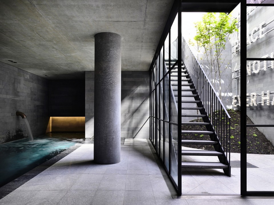 后半部分體量以現(xiàn)場澆筑的混凝土打造,并鋪設(shè)以水磨石風(fēng)格的石制地板、漆面的木制天花板以及青石材質(zhì)的墻面,從而與房屋的前半部分形成對比。不同于現(xiàn)代建筑中常見的極簡主義,房間內(nèi)的細部仍舊保持了古典風(fēng)格,以豐富的紋理延續(xù)著手工雕刻的質(zhì)感。