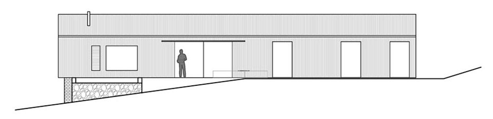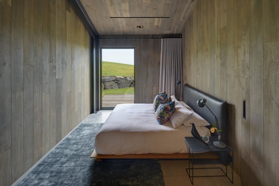 項目坐落于60公頃的開放田野上,附近是游牧的奶牛和波狀的丘陵,遠方是湖海與沙灘。在業主的要求下,該建筑擁有農牧小屋般的外貌,是一幢溫馨舒適的雙人度假屋。該設計以一種極其細致和精確的方式探究并展現了當地的鋼制門架類型建筑。南北走向的建筑搭配簡潔的平面規劃,讓建筑內部空間飽覽南面海景和北面田園風光。建筑入口與其對側的玻璃開口將另外兩側的景色圍框入內部空間里。