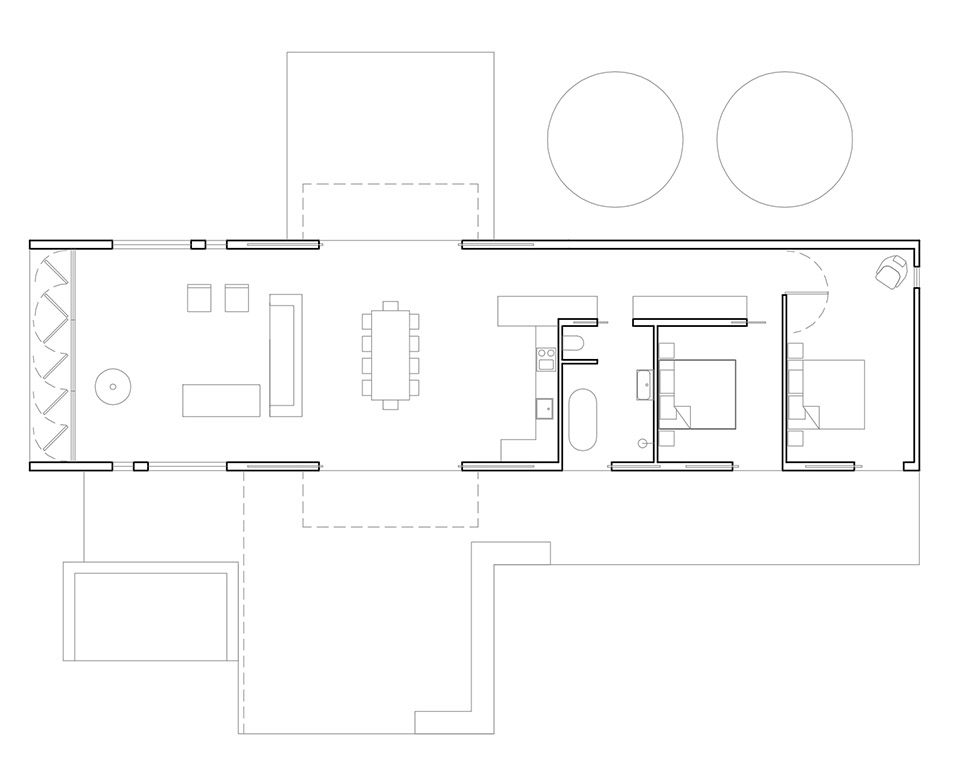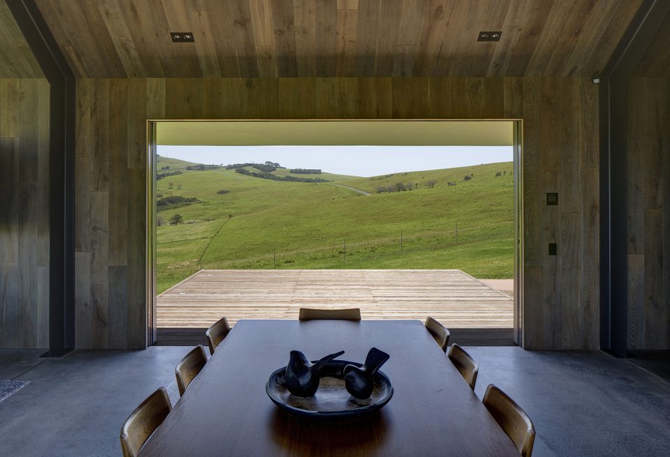 The project lies on 60ha of open field running dairy cows, with green rolling hills to a coastal lagoon, beach and ocean beyond. The response to the project, chiefly came from the clients brief to provide a modest two bed guest house that had a simple farm shed like appearance. The design explores the vernacular steel portal frame building typology in a highly refined and detailed way. The simple rectilinear floor-plan aligned with the long edges facing North/South, set up a strong primary axis as these also make best use of the ocean views to the south side and pastoral views to the north. At the point of entry, a framed view through the building to the ocean on the south side is formed.