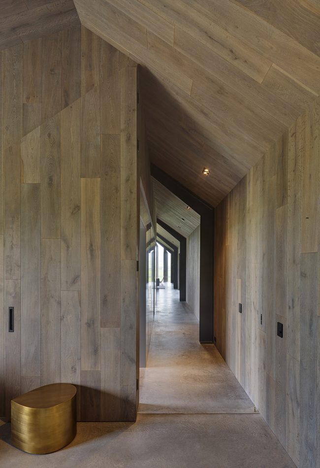 場地的定位為室內空間提供了獨特的觀景視野,斜陽越過懸崖灑在牧草地上,居住者沉浸在獨特的空間體驗之中。住宅整個西立面均可通過活動面板調節采光和觀景視野。該可調節系統為室內生活空間營造戲劇化的光環境,而通過隱藏在地板下的液壓缸,居住者便可以將整個立面關閉。項目中所采用的可持續性設計手段包括被動式太陽能,高厚度絕緣墻壁,雙層玻璃,雨水收集,紫外線過濾及處理,現場污水處理和太陽能供給。