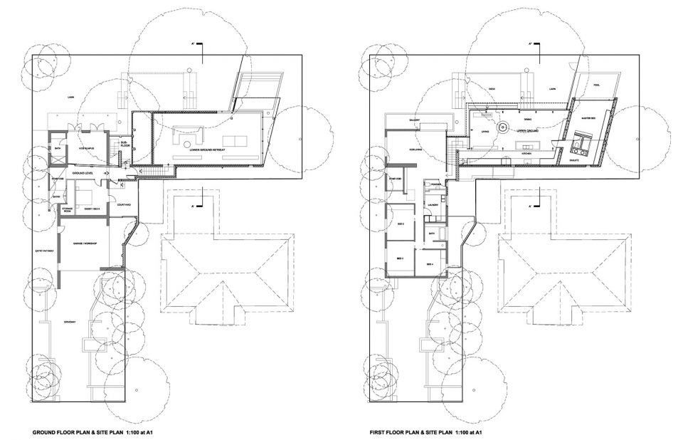 Simple ceramic pendant lights drape down at each post location and a dramatic fireplace reinforce the verticality of both the space and the neighbouring trees. The space defers to its mid-century roots in its horizontality, honesty in steel connections and braces, natural materials and joinery details. An external venetian blind enlarges the ubiquitous 50’s venetian, and the space is furnished with mid-century but forward looking furniture. The new living areas have been sited to face north east and north west. Large expanses of glass are utilized take in the natural beauty and allow winter sun to penetrate deep into the space. Sun penetration is regulated with northern eaves and an external venetian that spans the entire length of the main north eastern and north western fa?ades. All new spaces are naturally cross ventilated, and all natural timber Is native plantation oak.