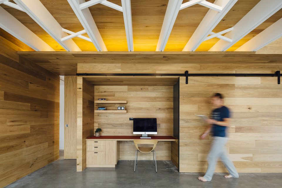 建筑表現為簡單的線性外貌,其朝北的長立面,令居住空間飽受自然光的沐浴。其他生活服務區域,如洗衣房和交通走廊位于建筑南邊,設于其上的立面開口增加了室內通風,促進空氣流通。住宅位于森林火災高發地帶。因此用于防火的Blackbutt窗框和Spotted Gum建筑外圍結構便成為首要之選。“我們選擇這些材料是因其天然的防火性能。而隨著這些天然材料的老化過程,它們也將映射周圍的林地景色。”Moloney解釋道。