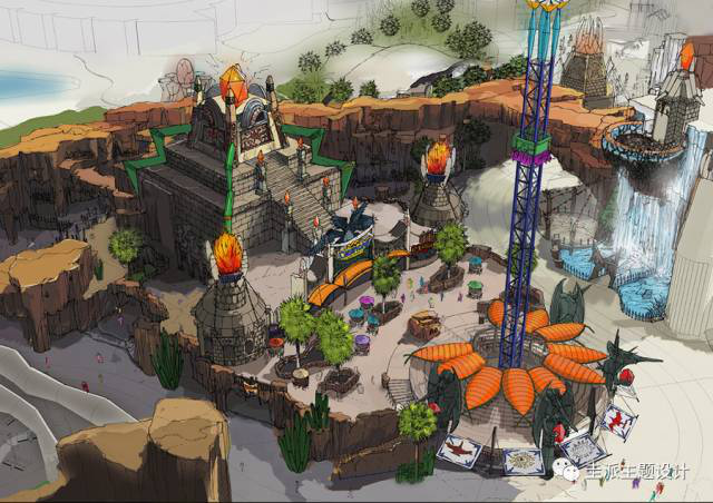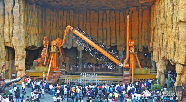 在游樂設備的設備和功能設計上,設計師選擇以一套異次元的恐龍史詩神話故事線為中心,融合設備、場景和功能性用房特點,串聯起整個園區的設計邏輯。