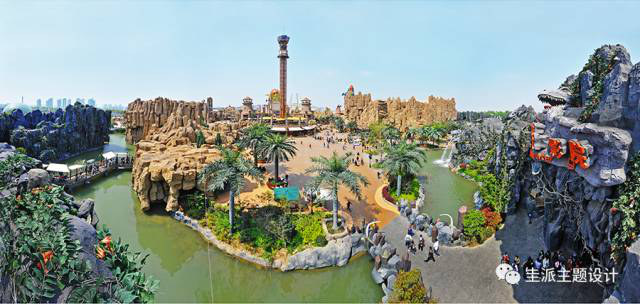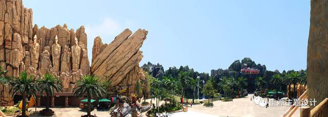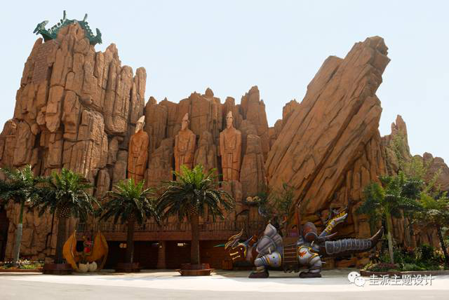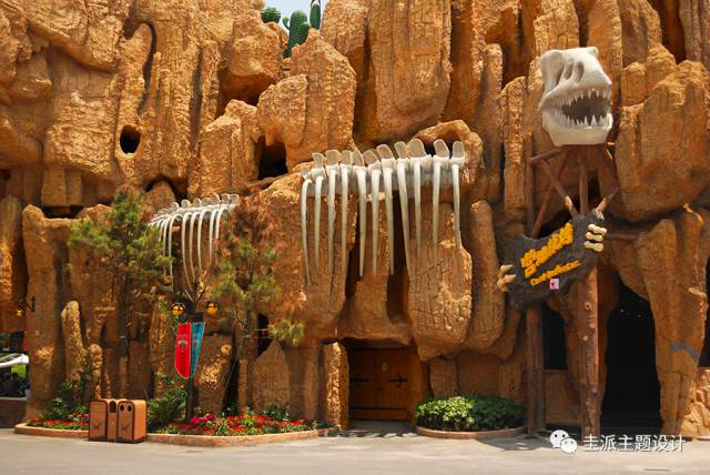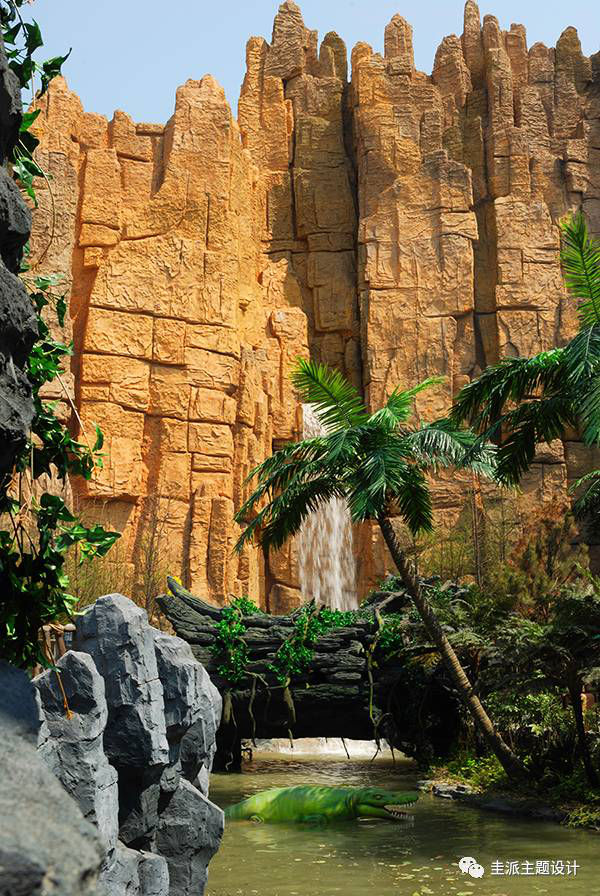 位于旱區的中心建筑以高聳的黃土仿石裝飾,體現出干旱少雨的恐龍生存生態。同時遮蔽住了后方的濕區景觀,達到了藏景的目的。
