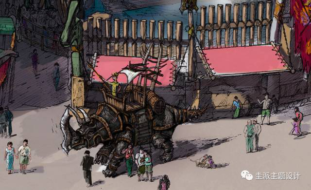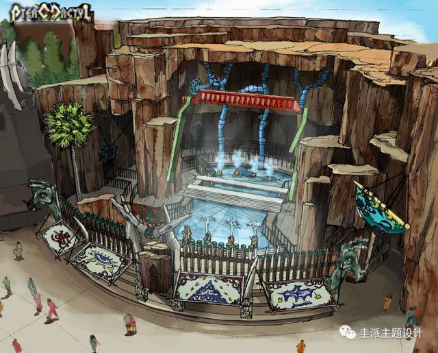 考慮到游樂設備大多是驚險刺激的高空拋射旋轉,故事選擇了天空的王者翼龍作為故事主角,并將場景設定為恐龍世界隱秘的軍事基地。一切設計都源于對恐龍世界軍事基地的思考和設定。